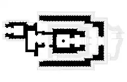 The temple is a combination of three shrines. The main shrine is dedicated to Shiva, as is the smaller second shrine. A small third shrine, between the two, is dedicated to a reclining Vishnu and may have had water channelled into the temple, entering the Vishnu shrine. The two Shiva shrines are orthogonal in configuration. The entrance is through a transverse barrel vault gopuram. The two shikharas have a pyramidal outline, each individual tier is distinct with overhanging eaves that cast dark shadows.[3] The outer wall of the shrine to Vishnu and the inner side of the boundary wall are extensively sculptured and topped by large sculptures of Nandi. The temple's outer walls are divided by pilasters into bays, the lower part being carved into a series of rearing lions. The temple walls are surrounded by sculptures of Nandi.[11]