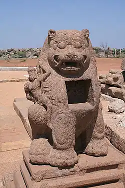 The temple has a garbhagriha (sanctum sanctorum) in which the deity, Sivalinga, is enshrined, and a small mandapa surrounded by a heavy outer wall with little space between for circumambulation. At the rear are two shrines facing in opposite directions. The inner shrine dedicated to Ksatriyasimnesvara is reached through a passage while the other, dedicated to Vishnu, is facing outwards. The Durga is seated on her lion vahana. A small shrine may have been in the cavity in the lion's chest. The Shore Temples, like many major Hindu temples, include both Shaivism and Vaishnavism temples and iconography.[3]