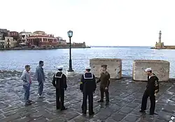 Shore patrol (SP) are service members who are provided to aid in security for the United States Navy, United States Coast Guard, United States Marine Corps, and the British Royal Navy while on shore.[1] They are often temporarily assigned personnel who receive limited training in law enforcement and are commonly armed with a baton.[2] Their primary function is to make certain that sailors, marines, and coast guardsmen on liberty do not become too rowdy. They will also provide assistance for Department of the Navy and U.S. Coast Guard uniformed personnel in relations with the civilian courts and police.[3]