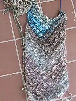 In German short rows, the work is turned and the last stitch worked is slipped purlwise with yarn in front to the right needle. Finally, the working yarn is pulled over the top of the needle to the back, which rotates the stitch on the needle so that it tips backwards, forming what appears to be a double-stitch, sometimes referred to as a “German double stitch”. The working yarn stays to the back for the next stitch if it is to be knitted, or rotated below the right needle and pulled to the front, if it is to be purled, both of which maintain the proper (“tipped back”) orientation of the German double stitch. Eventually, this German double stitch is worked like a single stitch, which masks its appearance as viewed from the Right Side to look like a regular stitch.