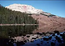 The Wind River Range is in the southern portion of the forest and is composed primarily of Precambrian granitic rock.[76] Gannett Peak, the tallest mountain in Wyoming, is in the northern part of the range. Altogether eight peaks exceed 13,500 ft (4,100 m) and 119 rise at least 12,000 ft (3,700 m) above sea level.[77] Fremont Peak, the second highest peak in the range, was originally believed to be the tallest mountain in the Rocky Mountains due to its prominence when viewed from the Oregon Trail by early pioneers.[78] The Wind River Range is popular with mountain climbers because of its solid rock and variety of routes.[79] The Cirque of the Towers in the Popo Agie Wilderness is one of the more popular climbing and hiking destinations, and an estimated 200 different climbing routes are located within the peaks that surround the cirque.[78]