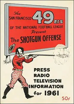 The formation was named by San Francisco 49ers head coach Red Hickey, who systematized the modern shotgun offense in 1960.[3] John Brodie was the first National Football League shotgun quarterback, beating out former starter Y. A. Tittle largely because he was mobile enough to effectively run the formation.