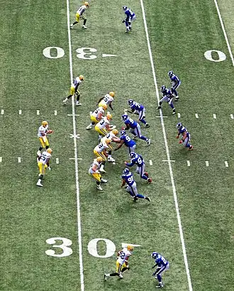 The shotgun formation is a formation used by the offensive team in gridiron football mainly for passing plays, although some teams use it as their base formation. Instead of the quarterback receiving the snap from center at the line of scrimmage, in the shotgun he stands further back, often five to seven yards off the line. Sometimes the quarterback will have a back on one or both sides before the snap, while other times he will be the lone player in the backfield with everyone spread out as receivers.