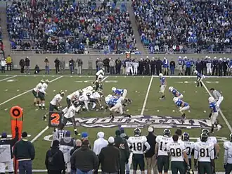 Shotgun combines elements of the short punt and spread formations — "spread" in that it has receivers spread widely instead of close to or behind the interior line players. The origins of the term are thought to be that it is like a "shotgun" in spraying receivers around the field.[1] (The alignment of the players also suggests the shape of an actual shotgun.) Formations similar or identical to the shotgun used decades previously would be called names such as "spread double wing". Short punt formations (so called because the distance between the snapper and the ostensible punter is shorter than in long punt formation) do not usually have as much emphasis on wide receivers.