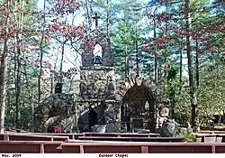 The church at Shrine Mont is the Cathedral Shrine of the Transfiguration, an open-air sanctuary consecrated in 1925. Each of its stones was pulled by horse or rolled by local people from the mountain that embraces it. The baptismal font was originally a dugout stone used by Native Americans to grind corn.
