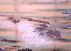Takashima Shūhan established two companies of infantry equipped with guns, as well as one artillery battery, making him Japan's first modern student of Western arms.[2] In 1841, Takashima Shūhan caught the attention of Bakufu official Egawa Tarōzaemon. Takashima made a demonstration with 125 men, using Dutch Rangaku textbooks and Dutch commands for drilling.[2] He demonstrated the use of four cannons and 50 Western guns.[5] His students included Egawa Hidekatsu.