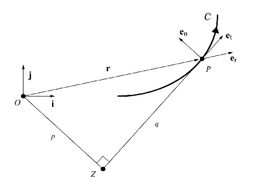 Let a particle P of mass m move in a two-dimensional Euclidean space (planar motion). Suppose that C is the curve traced out by P and s is the arc length of C corresponding to time t. Let O be an arbitrary origin in the plane and {i,j} be a fixed orthonormal basis. The position vector of the particle is