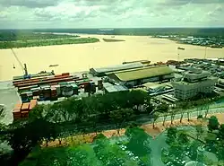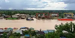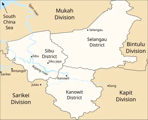 Sibu /ˈsb/ is a landlocked city located in the central region of Sarawak, Malaysia. It serves as the capital of Sibu District within Sibu Division and is situated on the island of Borneo. Covering an area of 129.5 square kilometres (50.0 sq mi),[12] the city is positioned at the confluence of the Rajang and Igan Rivers,[13] approximately 60 kilometres from the South China Sea[14] and 191.5 kilometres (119 mi) north-east of the state capital, Kuching.[15]