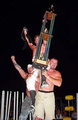 Mondo fought Messiah in the first round and came up short against Wifebeater at CZW's first Tournament of Death in a memorable spot where Mondo received a weedwhacker to the stomach.[14] However, Mondo and Wifebeater would team up to face Necro Butcher and "Mr Insanity" Toby Klein at Ultraviolent Freedom of Expression on September 14, 2002.[15][16] His partner Blade returned at Beyond The Barrier on October 12, 2002, with Mondo defeating Johnny Kashmere.[17] At Cage of Death IV on December 13, 2002, he competed in a Tables, Ladders, and Chairs match against The Backseat Boyz with Mondo as his partner but ended up losing. The Backseats won in the end with the Acid Bomb whilst Blade's head was in the ladder.[18] Mondo failed to capture the CZW Death Match Championship a three-way with Zandig and Nate Hatred at Live Again in January 2003. Mondo had his swan song with a bump that will never be forgotten against Zandig, and a victory over Ian Rotten to win CZW's 2nd annual Tournament of Death in July 2003.[15]