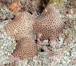 Siderastrea radians is either encrusting or grows in small, dimpled hummocks up to 30 centimetres (12 in) across but most colonies are much smaller than this.[3] Occasionally it occurs as small calcareous pebbles that roll around in seagrass meadows or as loose flat discs in shallow rocky places.[4] The corallites are not circular but are triangular or four-sided and deep, with 30 to 40 small ridges called septa.[3] They have a dark interior that contrasts in colour with the pale surface of the coral which is greyish, greenish or light brown.[5] The polyps are retracted back into these corallites during the day but emerge at night, extending their tentacles to feed. Each of these has a small knob of stinging cnidocytes at its tip. The lesser starlet coral can be confused with the closely related massive starlet coral (Siderastrea siderea) but that usually grows at greater depths, is larger and has less deep, more rounded corallites, each with 50 to 60 septa.[3]