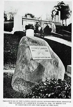 Lanier finally succumbed to complications caused by his tuberculosis[11] on September 7, 1881, while convalescing with his family near Lynn, North Carolina. He was 39. He is buried in Green Mount Cemetery in Baltimore.