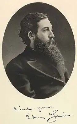 Sidney Clopton Lanier[1] (February 3, 1842 – September 7, 1881) was an American musician, poet and author. He served in the Confederate States Army as a private,[2] worked on a blockade-running ship for which he was imprisoned (resulting in his catching tuberculosis), taught, worked at a hotel where he gave musical performances, was a church organist, and worked as a lawyer. As a poet he sometimes used dialects. Many of his poems are written in heightened, but often archaic, American English. He became a flautist and sold poems to publications. He eventually became a professor of literature at Johns Hopkins University in Baltimore, and is known for his adaptation of musical meter to poetry. Many schools, other structures and two lakes are named for him, and he became hailed in the South as the "poet of the Confederacy".[3] A 1972 US postage stamp honored him as an "American poet".