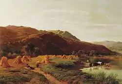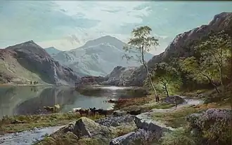 Sidney Richard Percy had his greatest success painting landscapes of grazing cattle, typically set against backgrounds of distant mountains and cloudy skies. The prevailing hues of his landscapes are earth tones and soft greens, accentuated by a variety of pastel hues. The detail in his work is part of its appeal, and "it was remarked that his rocks and stones were sufficiently accurate to have served as illustrations to the writings of Sir Roderick Murchison, the popular 19th-century geologist."[10] Llyn-y-Ddinas, North Wales, one of his more popular works on the internet, displays these qualities. He also painted landscapes of farm fields, wheel-rutted country roads, and the occasional boat scene on a lake.