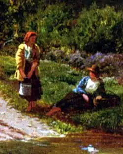 His art interests were not limited to painting, and he was also an amateur photographer, in a day when photography was new and exciting, yet still a poorly understood medium. He frequently used his own photographs of gypsies in the Barnes or Wimbledon Common as the basis for similar figures in his paintings, even though some contemporary critics complained how these figures ruined what otherwise would be delightful landscapes. A classic example is Storm Gathering on Cader Idris, North Wales, which he exhibited in 1856 at the Royal Academy, and which has the same gypsy girls in it as one of seven of his photographs in the Victoria and Albert Museum.[10] In fact, this painting is one of the ones singled out for some of the aforementioned criticism. These same girls appear in his 1861 work A Rest on the Roadside, and they appear again, but reversed, in his 1873 version of Llyn-y-Ddinas, North Wales, showing that he repeated themes when convenient.