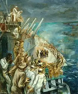 Simon enlisted in the U.S. Army on November 11, 1942,[7] eventually reaching the rank of captain. At age 25, then stationed at Fort Belvoir, Virginia, Simon's art talent was recognized and he was tasked with heading and developing a special service branch referred to as [the] Morale Division. This experimental art and design test pilot project led the way for other, similar morale projects throughout the military. Simon's Morale Division was tasked with improving the appeal of the recreation center with murals and other appointments.[8] It was while Simon was stationed at Fort Belvoir that he met and worked with fellow soldier Willard W.Cummings,[8] who was also part of this Morale Division art detail. Simon and Cummings would later co-found The Skowhegan School of Painting and Sculpture along with two other artists,.[9] From March 1943 – October 1945, Captain Simon served as an American official war artist and was assigned to General Douglas MacArthur's headquarters.[10] Simon, along with three other artists of his art unit, covered major operations in New Guinea and the Philippines during the South West Pacific Theater of World War II operations.[8] His duties included painting, drawing, and field reconnaissance intelligence. Simon was chosen to paint the formal surrender ceremony as witnessed September 2, 1945, in Tokyo Bay aboard battleship USS Missouri.[11][12][13] referred to as V-J Day, ending WWII.[14] This historical painting is reported to have hung in the White House.[12] Simon was discharged and released on April 19, 1946.