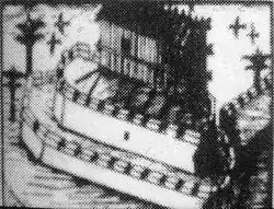 Desfarges finally negotiated in the end of September 1688 an agreement to leave the country with his men on board the Oriflamme and two Siamese ships, the Siam and the Louvo, provided by Phetracha.[14][37] The new king Phetracha gave back all his French prisoners. To guarantee the agreement, the French were supposed to leave the country holding two Siamese hostages, while three French hostages were supposed to remain in Siam until the Siamese ships were returned: Mgr Laneau, Bishop of Metellopolis, Véret, the head of the French factory in Siam, and Chevalier Desfarges, the younger son of General Desfarges.[38]