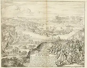 The siege of Caudebec (French: Retraite du Duc de Parme) was a military event that took place between early May to 23 May 1592 as part of the French Wars of Religion and the Anglo-Spanish War (1585–1604).[3][4] The Spanish and the French Catholic League forces of Duke of Parma had captured the town of Caudebec on the Seine, where they soon found themselves trapped by the reinforced Royalist Protestant army led by Henry of Navarre consisting of French, English, and Dutch troops.[5] Seeing that Henry's force had now surrounded him, Parma seeing that defeat was inevitable, pulled his 15,000 men across the river in a single night to escape and retreat to the south.[6][7]
