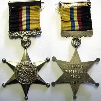 On 17 February, Kekewich was promoted to the rank of full colonel while French was promoted to major general.[66] A number of medals were issued to combatants, notably the Kimberley Star, which was instituted by Mayor H. A. Oliver. Since the medal was not an official one, it could not be worn with military uniforms. The official awards for the siege and relief of Kimberley were, respectively, the "Defence of Kimberley" and "Relief of Kimberley" clasps to the Queen's South Africa Medal.[67][68]