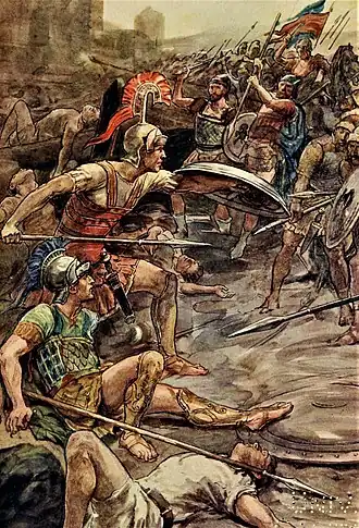 The Siege of Mantinea occurred in 385 BC, and resulted in a victory of the Spartans over the city of Mantinea, which was defeated and dismembered.[1] The Spartans wanted to ensure that Mantinea would not develop into a threat to their own power, and ordered them to take down their walls, but they refused. With that excuse, the Spartans diverted the river onto the walls by breaking dams and digging canals to make them crumble, since the Mantineans refused to come out and were able to resist a siege for many months ahead. Once trapped in the flooded city, they were forced to fight, and the Spartans pushed the Theban forces on the forefront only to attack with their cavalry at the end and finish the enemy. On this occasion, Epaminondas, then fighting on the side of the Spartans, famously rescued his fellow Theban Pelopidas.[2][3]