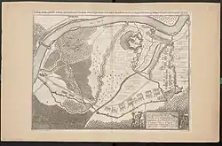 Turenne convinced d'Enghien not to try retaking Freiburg but instead to march north to besiege Philippsburg.[8] The Weimar cavalry in French service under Taupadel and Rosen swept through Baden, followed by the French infantry. Most of the French army occupied the area between the Rhine, the Black Forest and Odenwald. Only 5,000 men were used to encircle and invest Philippsburg, arriving on 25 August. The Imperial garrison with 500 men under Baumberger had 100 cannons in its arsenal, but not enough personnel and space to use more than a few at the same time.[1] Also, the marshes that protected the fortress had been dried by a hot summer.[8] Baumberger was not very confident in his men and gave up the redoubt northwest of the fortress on 26 August to concentrate on the defence of the core fortress. D'Enghien initially focused on building a circumvallation to cover the siege works against a possible relief attempt by Mercy.[1]