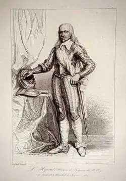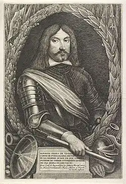 Johann von Nassau-Siegen, meanwhile, found some French troops and began to withdraw in disorder.[42] La Force immediately sent his cavalry and some musketeers under Comte d'Arpajoux to harass the rear-guard of the Count.[33] The Spanish cavalry was in danger of being disbanded for a moment, but a sleeve of musketeers under Captain Don Antonio Pimentel, hidden in some hedges, managed to hold back the attack giving time to the Count to withdraw his troops.[43] Pimentel was badly wounded in an arm, but he and his men managed to retreat because Arpajoux did not want to waste time finishing them and advanced towards Fort St. Jean.[44] The retreat of the Count was soon noticed by Saavedra. Fearing that the relief force arrived on time, the Maestro de Campo sent his aid to ask Thomas of Carignano for permission to assault the fort, which was given.[45]