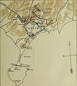 The small walled town of Tarifa seemed almost impossible to defend. Overlooked at short range by higher ground, with walls unprotected against artillery fire, it would easily fall to a serious attack.[3] Skerrett proposed abandoning the defence and embarking on ships. Captain C. F. Smith of the Corps of Royal Engineers strongly opposed the idea; he had noted that inside the walls, the ground level was much lower which combined with a deep narrow river that flowed through the town would make that assault quite hazardous.[3] Skerrett was checkmated when the ships were ordered back to Gibraltar, the commanders being forbidden to embark a single soldier, by General Campbell, the Governor of Gibraltar.[3]