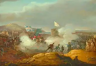 General of Division Jean François Leval commanded a corps of 15,000 soldiers, with 8,000 present[3] with 16 siege guns. His French troops included three battalions of the 16th Light Infantry Regiment, two battalions each of the 43rd, 51st, 54th, 63rd, 94th, and 95th Line Infantry Regiments, and one battalion each of the 27th Light and 8th Line Infantry Regiments. Leval's Polish contingent was made up of two battalions each of the 7th and 9th Infantry Regiments and his cavalry comprised four squadrons each of the 16th and 21st Dragoon Regiments.[4]