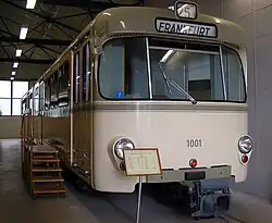 In the early 1960s, Duewag developed and manufactured a prototype of a new tram for the Frankfurt U-Bahn. The design was largely based on the previously delivered trams, but added electronic controls that allowed several railcars to be coupled together to form trains, and a floor height of 93 cm (37 in) that made it possible to board from platforms with a height of 32 to 56 cm (13 to 22 in) without having to add a folding step previously used. The new car was debuted at the International Transport Exhibition in Munich in 1965 and two vehicles arrived in Frankfurt in May 1966. There was no further production of the U1, and they were only used in regular service for a few years before being retired in 1976 because of their incompatibility with the rest of the fleet.
