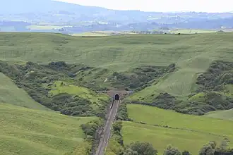 In August 1861, the company obtained an authorisation from the Italian government to continue the Siena–Chiusi line towards Orvieto to connect with the Roma–Foligno line near Orte.[6] The Torrita di Siena–Salarco section (6 km) was opened on 20 October 1861.[3] Salarco station was located near a stream of the same name in the locality of Sciarti, in Abbadia di Montepulciano. An iron bridge with two spans was built to cross the stream—hence the locality is called Ponte di Ferro (iron bridge)—near a monumental brick waterfall (La Serra) built by the engineer Alessandro Manetti in 1849, during land reclamation work in the area. The characteristic nineteenth-century bridge was destroyed during the Second World War, by retreating German troops on 30 June 1944.[7]