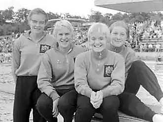 Cocky Gastelaars, Judith de Nijs, Sita Posthumus and Astrid Ording in 1959 after setting a national record in the 4×100 m freestyle relay