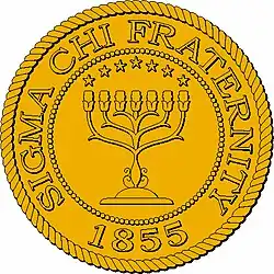 The seal of Sigma Chi is circular. On the outer edge is "Sigma Chi Fraternity" and at the bottom are the numbers "1855". In the middle lie seven stars and a seven-branched candlestick.