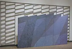 During her career, Stuart has been the recipient of a National Endowment for the Arts Painting Fellowship (1976), two National Endowment for the Arts mural commissions (1977 and 1985), a South Dakota Arts Council Artist Fellowship (1986) and a New Mexico Experimental Glass Workshop Fellowship (2012). Art critics and gallery directors place Stuart’s work in a broad context beyond the geographic residency of her career. “She emphasizes continuity, endlessness, surge, and strives for a broader concept of form through a-compositional devices and a tough, sometimes subliminal, and always subsidiary use of color,” Jan van der Marck observed in artscanada.[4]