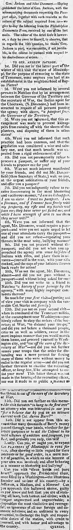 In 1811, Dinsmoor found himself embroiled in a controversy with Andrew Jackson, and by 1813, he was looking for a new government post. The controversy began with reports from the Natchez region that enslaved people were being encouraged to run away by traders from Tennessee. Dinsmoor was asked to protect the property of the local planters, and he began instituting an often-ignored requirement that anyone traveling the Natchez Trace carry papers with them proving their ownership of any enslaved people they claimed. Jackson refused to do so and became quite furious when he heard Dinsmoor was vigorously enforcing the rule, at one point threatening to arm the people he enslaved on his next time through, kill Dinsmoor, and burn the agency house to the ground. Though he never found the right moment to carry out his threat, his messages to the War Department may have had something to do with Dinsmoor being replaced in 1813.