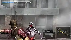 At E3 2006, Origins was announced as in development by Climax Group's development team in Los Angeles, instead of by Konami's Team Silent who had developed previous installments.[21] The first previews of the game featured a departure from the third-person view typical of the series to a Resident Evil 4-style camera angle, and an emphasis on action and combat to a greater degree than the previous installments in the series.[22][23] In the previews, Travis had six weapons, divided equally between melee weapons and firearms.[22][23] Additional changes included a laser sight for his pistol and an option for the player to barricade areas.[22][24] At the time, the game was expected to be released in late 2006.[25]