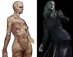 Like all Silent Hill games, one of Silent Hill 3's influences is the film Jacob's Ladder:[23] one of the subway platforms is named Bergen Street Station, the station Jacob was inquiring about at the beginning of the film.[3] The developers also cited horror writer Stephen King as another of their influences.[23] Silent Hill 3 incorporates references drawn from real-life actors and actresses. Douglas Cartland's name came from American actor Douglas Fairbanks.[26] The developers stated that his name "just seemed to suit him" and that there was no true connection to his namesake. During the sketching process, his character was modeled after actors Giancarlo Giannini and Ian Holm.[26] It was noted even during the concept designs that Cartland was designed as a middle-aged detective. Richard Grosse, the actor that played Douglas, died on April 12, 2003, a month before the game's release.[27] Claudia Wolf's character was considered the most difficult to design.[26] Early sketches revealed that the creators wanted to dress her like a holy woman, and at one point she had a shaved head, with her body covered with tattoos, however, the creators thought that this way of showing her malevolent side was too obvious.[26] Eventually, the creators decided to model her on Julianne Moore, and then remove her eyebrows, so that the appearance was slightly skewed.[26] She was first named "Christie", but it was deemed too "cute" and the character was eventually named after Italian actress Claudia Cardinale.[26] Vincent's name originated from actor Vincent Gallo in connection with his unshaven look.[26] Early designs were based on actor Ethan Hawke and focused on capturing a look of "derangement and moodiness."[26]
