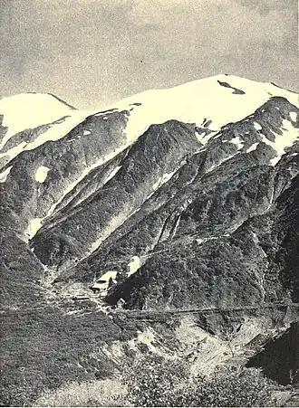 Placer was found in the basin's Gold Creek in 1880 by Richard Harris and Joe Juneau.[6][7] This gold discovery led to the creation of the town called Juneau.[3] Over the next nine years, sluicing operations recovered thousands of ounces of gold. Sitka engineer George E. Pilz is closely connected to development in the basin,[8] as well as having grubstaked the prospectors Harris and Juneau.[3] By the end of the decade, large scale hydraulic mining was in operation.[9] The mines were reached by a 3.5 miles (5.6 km) wagon road that zig-zagged across the hill.[5]