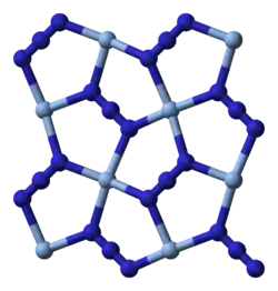 X-ray crystallography shows that AgN3 is a coordination polymer with square planar Ag+ coordinated by four azide ligands. Correspondingly, each end of each azide ligand is connected to a pair of Ag+ centers. The structure consists of two-dimensional AgN3 layers stacked one on top of the other, with weaker Ag–N bonds between layers. The coordination of Ag+ can alternatively be described as highly distorted 4 + 2 octahedral, the two more distant nitrogen atoms being part of the layers above and below.[3]