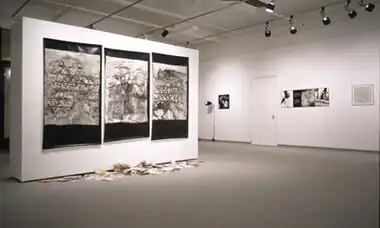 Malagrino's installations have investigated the intersection of specific global histories, memory, human action and accountability.[20][26][27][3] The multimedia work Between Times/Between Worlds (1995) superimposed original, appropriated and manipulated visual and audio layers and employed theater lighting to create what curator Andrea Inselman called "an intricate weaving" of personal, cultural, environmental and political histories of Latin America and North America.[20][24] Inscriptions in the War Zone (1996–8)[28][29] combined photographs and text to suggest the weight of absence—particularly of the human body—juxtaposing traces and fragments, such as a fingerprint or bloodstain, the imprint of a face on cloth, tattered photographs of lost loved ones, or catalogues of possessions.[30][31][32] Writer Siobhan Somerville suggested that the work's confrontation with the political violence of Argentina summoned other traumas, such as those in Nazi Germany and Cambodia, posing questions about the representation of tragedy, the nature of evidence and the production of "facts", and the erasure of history.[3]