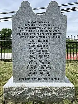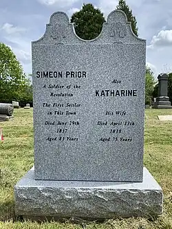 On June 24, 2020, descendants of Simeon and Katharine Prior, Chapters of Sons and Daughters of the American Revolution, and color guard of Cuyahoga Falls Police and Fire Fighters, gathered to dedicate a new headstone for Simeon and his wife Katharine. Kenneth Clarke and Emery Prior, both direct descendants of Simeon, collaborated to replace the weatherworn and mostly indecipherable marble headstone of Northampton Ohio's founders with a new headstone carved out of granite from Barre, Vermont. The front of the new headstone copies the text of the old headstone and on the back are the names of Simeon's children and a short history of the family. The new text on the back of the stone reads as such: in 1802 Simeon and Katharine (Wight) Prior from Northampton, Massachusetts, with their children below, were the first settlers of Northampton Township, now Cuyahoga Falls, Ohio. Sarah, 1781–1847; William, 1783–1872; David, 1784–1866; Elisha, 1786– 1867; John 1788–1790; Mary, 1789–1880; Judith, 1791–1862; Gurden, 179 3–1885; Lydia, 1795–1842; Jerusha, 1797–1846; Charles, 1799–1879; Elizabeth, 1801–1874; Abigail, 1803–1807; Joseph, 1805–1806; Erastus, 1809–1866. Rededicated by the Family in 2020. The old headstone artifact is now part of the Cuyahoga Falls Historical Society collection. [16]