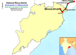 It operates as train number 18007 from Shalimar to Bhanjpur and as train number 18008 in the reverse direction serving the states of West Bengal and Odisha.[1]