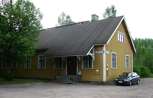 The Simpele railway station (Finnish: Simpeleen rautatieasema, Swedish: Simpele järnvägsstation) is located in the municipality of Rautjärvi, Finland, in the urban area and municipal seat of Simpele. It is located along the Kouvola–Joensuu railway,[3] and its neighboring stations are Imatra in the west and Parikkala in the east.[4]