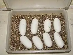 The Sinaloan milk snake mates from early May to late June, sometimes twice a year. The brumation period is between November and February. The female lays an average of 5–15 elongated eggs beneath rotting wood, boards, rocks and rotting vegetation. The eggs hatch after about 60 days. Like other members of the king snake family, the Sinaloan milk snake sometimes eats other snakes and does have at least some immunity to their venom.