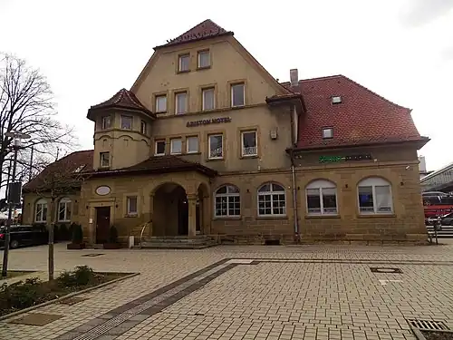 Sindelfingen station (German: Bahnhof Sindelfingen) is a railway station in the municipality of Sindelfingen, located in the Böblingen district in Baden-Württemberg, Germany. It is part of the Stuttgart S-Bahn and trains go at a frequency of two trains an hour in both directions. Across the street is the Sindelfingen central bus station, and in the opposite direction it borders the Mercedes-Benz plant.