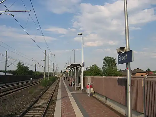 The original Sindorf station was opened at line-km 22.4 of the Cologne–Aachen railway in 1912 and had a platform north and south of the original line. With the commissioning of the S-Bahn tracks in 2002, the station was relocated to line-km 21.4 and redesignated as a halt. In 2004, citizens complained to the then Minister of Transport Axel Horstmann about the width of the platform. They considered that the three-metre-wide platform was too narrow, which was particularly evident in peak hour traffic.[4] As a result, the ticket machines were relocated.[5] After renewed criticism, the Zweckverband Nahverkehr Rheinland (Rhineland Municipal Transport Association) issued a report in early 2010, in which the maximum capacity of the platform was given as 190 people. However, a maximum of 164 people were recorded in passenger counts in the morning peak hour, which means that the requirements are formally met.[5]