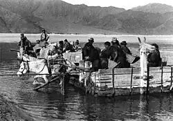 Ferry boat on the Yarlung Tsangpo River with carved horse's head on the prow (right), photo from 1938.