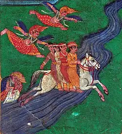 Singha Sartha spread the word among his companions, and they all agreed that they had to flee. The next day before dawn, they slipped out of their rooms and reached the river bank. There was a horse as promised, and they all got on its back. The Bodhisattva had taken the form of the horse to help the merchants escape. As the horse took off for the other bank, the women came running after them, pleading not to be left behind. Their sorrowful cries made the men look back, and they were dragged off the horse. Singha Sartha was the only one who maintained his self-control, and he returned to Nepal safely.[5][6]