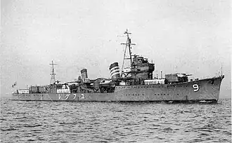 The Uraga Dock Company in Uraga, Kanagawa, laid the keel plates of Shinkyo Maru on 25 February 1932. She was launched on 24 November that year, and completed on 11 April 1933.[1] Her length was 298.2 ft (90.9 m); her beam was 44.9 ft (13.7 m); and her depth was 23.6 ft (7.2 m). Her tonnages were 2,672 GRT and 1,554 NRT.[2] She had a raked bow, cruiser stern, and well decks fore and aft. She had two masts, and her engine room; boiler room; superstructure; and single funnel were amidships.[3]