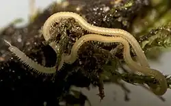 Millipedes in the order Siphonophorida are long and worm-like, reaching up to 36 millimetres (1.4 in) in length and up to 190 body segments. Eyes are absent, and in many species the head is elongated into a long beak, with mandibles highly reduced. The beak may serve in a suctorial function. The body has a dense covering of fine setae. Each body segment consists of a dorsal tergite, two lateral pleurites, and ventral sternite, which are unfused. The male reproductive appendages (gonopods) are simple and leg-like, consisting of the ninth and 10th leg pairs. This lack of specialization has led to Siphonophorida being called a "taxonomist's nightmare",[1] and Jeekel (cited in[1]) jokingly gave the order the "taxonomists' award for least popular group among diplopods".[2]