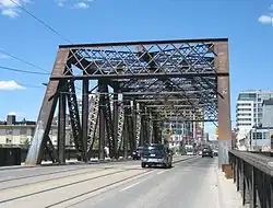 In 1931, the bridge was moved and re-aligned (Bathurst Street was at an angle south of Front Street) to support streetcar service south of the railway tracks at that location. A new bridge south of the bridge was constructed to connect the south end of the bridge, connecting Bathurst to Fleet Street. Fort York lost its road access in the change, and a footbridge to the east entrance was constructed.[2]