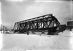 The steel truss bridge was built in 1903 and used for the Great Western Railway over the Humber River (northside of then Lakeshore Road at mouth of the river).[1] It was dis-assembled and re-located in 1916 to Bathurst Street and converted for road traffic.[1] The bridge served to connect Bathurst Street at Front Street to Fort York.[2]